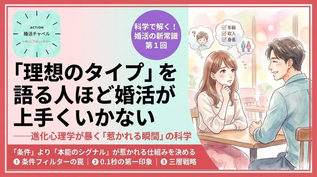 科学で解く!婚活の新常識 第1回変わった切り口 「理想のタイプ」を語る人ほど婚活が上手くいかない——進化心理学が暴く「惹かれる瞬間」の科学 公開日: 2026-04-13 / 対象: 婚活中の全世代 シリーズ「科学で解く!婚活の新常識」第1回:「理想のタイプ」... 婚活