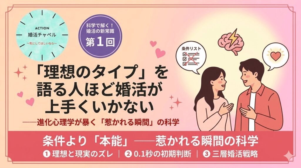 科学で解く!婚活の新常識 第1回 変わった切り口 「理想のタイプ」を語る人ほど婚活が上手くいかない——進化心理学が暴く「惹かれる瞬間」の科学 公開日: 2026-04-13 / 対象: 婚活中の全世代 / 文字数: 約6000文字 📚 シリーズ「科学で解く!婚活の新常識... 婚活