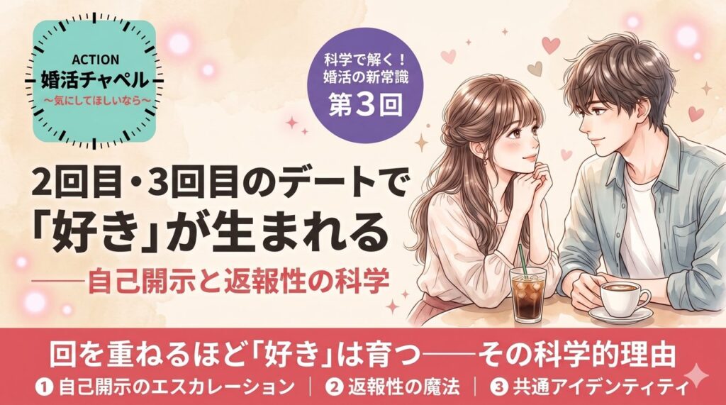 科学で解く!婚活の新常識 第2回変わった切り口 初デートで「また会いたい」と思わせる心理学——好感度を上げる行動科学の教え 公開日: 2026-04-13 / 対象: 婚活中の全世代 シリーズ「科学で解く!婚活の新常識」第1回:「理想のタイプ」を語る人ほど婚活... 婚活