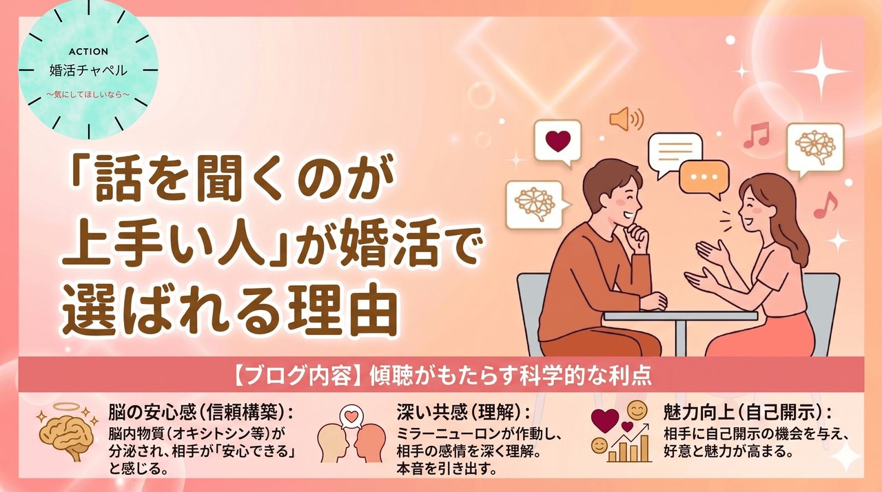 人は「話を聞いてくれる人」に、ドーパミン(また話したいという動機)とオキシトシン(信頼・愛着)を同時に分泌します。これが「聞くのが上手い人」が婚活で選ばれる神経科学的な根拠です。感情のラベリング返し・評価しない質問・沈黙を埋めない3つのスキルを意識することで、傾聴力は高まります。婚活の場で「また会いたい人」として選ばれる可能性が、着実に広がるでしょう。